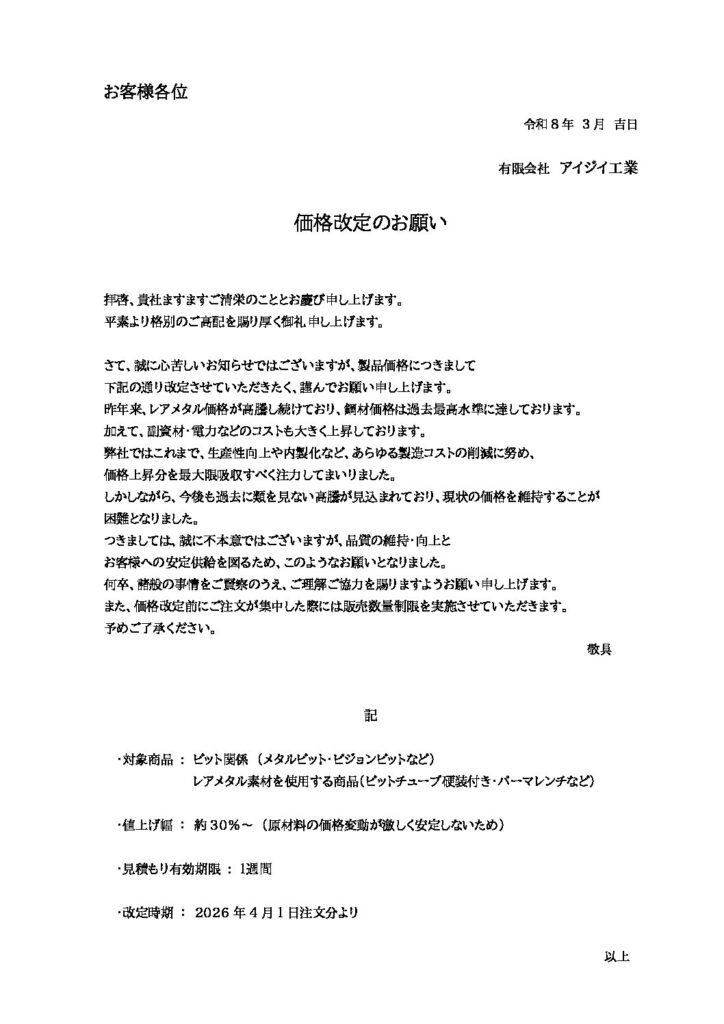 価格改定のお知らせ